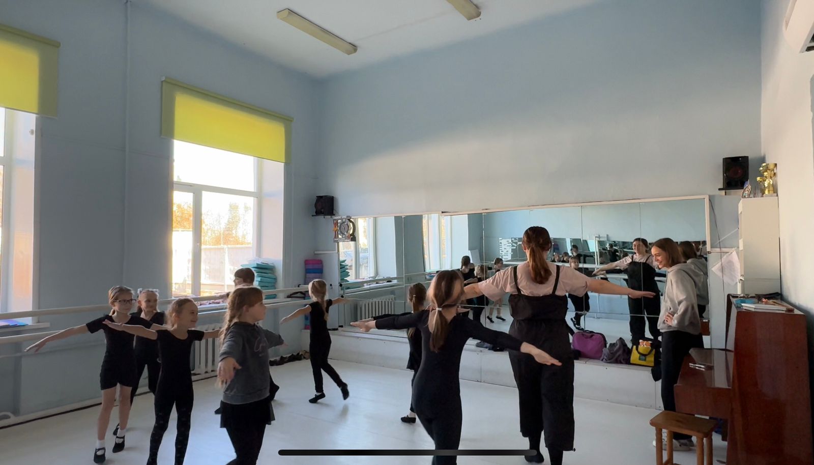 Наталья Владимировна продемонстрировала урок по предмету «Гимнастика» во 2 классе. Вместе со своими обучающимися преподаватель провела урок на тему «Партерная гимнастика, как начальный этап подготовки к классическому танцу».